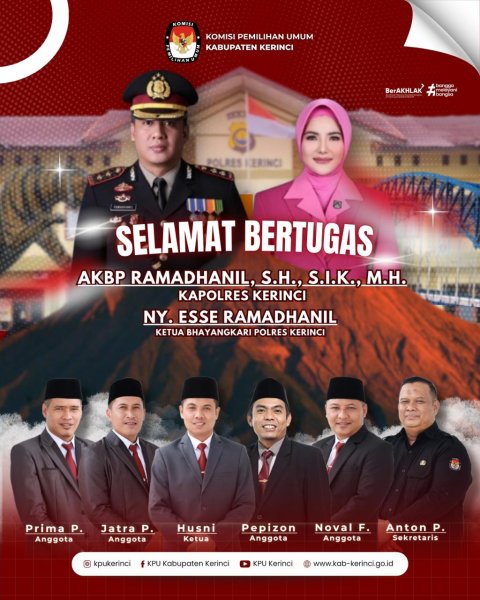 Komisi Pemilihan Umum (KPU) Kabupaten Kerinci menyampaikan ucapan selamat bertugas kepada AKBP Ramadhanil, SH, SIK, MH sebagai Kapolres Kerinci , serta kepada Ny. Esse Ramadhanil sebagai Ketua Bhayangkari Polres Kerinci . Ucapan ini disampaikan sebagai bentuk dukungan dan sinergi kelembagaan dalam menjaga stabilitas keamanan, perdamaian masyarakat, serta mendukung penyelenggaraan demokrasi dan pemilu yang aman, tertib, dan berintegritas di Kabupaten Kerinci. ....