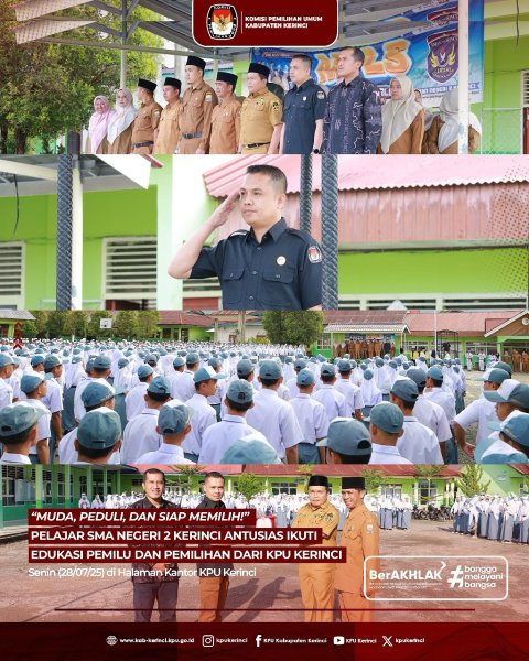 #TemanPemilih, Kerinci, (28/07/2025) — Dalam upaya meningkatkan kesadaran politik di kalangan generasi muda, Komisi Pemilihan Umum (KPU) Kabupaten Kerinci menggelar kegiatan Sosialisasi dan Pendidikan Pemilih di SMA Negeri 2 Kerinci. KPU menyasar pemilih pemula dengan pendekatan edukatif dan inspiratif. . Kegiatan ini disambut antusias oleh para pelajar yang merupakan bagian dari pemilih pemula. Dengan semangat tinggi, mereka mengikuti materi yang disampaikan, mulai dari pentingnya hak suara, peran aktif dalam proses demokrasi, hingga Pemutakhiran Data Pemilih Berkelanjutan (PDPB). . Ketua KPU Kabupaten Kerinci, Husni, menyampaikan bahwa pemilih pemula merupakan kekuatan penting dalam demokrasi, dan harus dibekali dengan informasi yang benar serta sikap kritis sejak dini. “Kita ingin para pelajar bukan hanya menjadi pemilih, tetapi juga menjadi agen perubahan dan penjaga demokrasi,” ungkapnya. . Melalui program ini, KPU Kerinci berharap tumbuhnya kesadaran politik yang sehat di kalangan pelajar, sekaligus menyiapkan mereka menjadi pemilih cerdas dan bertanggung jawab pada Pemilu dan Pilkada mendatang. ....