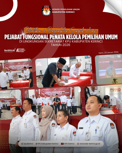 Kamis, 22 Januari 2026, Komisi Pemilihan Umum (KPU) melaksanakan pelantikan dan pengambilan sumpah/janji Pejabat Fungsional Penata Kelola Pemilihan Umum di lingkungan Sekretariat Jenderal KPU, Sekretariat KPU Provinsi/KIP Aceh, serta Sekretariat KPU/KIP Kabupaten/Kota Tahun 2026. Pada kesempatan tersebut, sebanyak lima Pejabat Fungsional Penata Kelola Pemilu Ahli Pertama di lingkungan KPU Kabupaten Kerinci dilantik secara resmi di Aula Kantor KPU Kabupaten Kerinci, yaitu Anwar Firmansyah, Wahyu Tio Ramadan, Pasko Brutus Damanik, Eka Saputri, dan Sartono. Pelantikan ini merupakan bagian dari upaya penguatan sumber daya manusia serta peningkatan profesionalitas aparatur sekretariat dalam mendukung penyelenggaraan pemilu yang berintegritas, transparan, dan akuntabel. ....