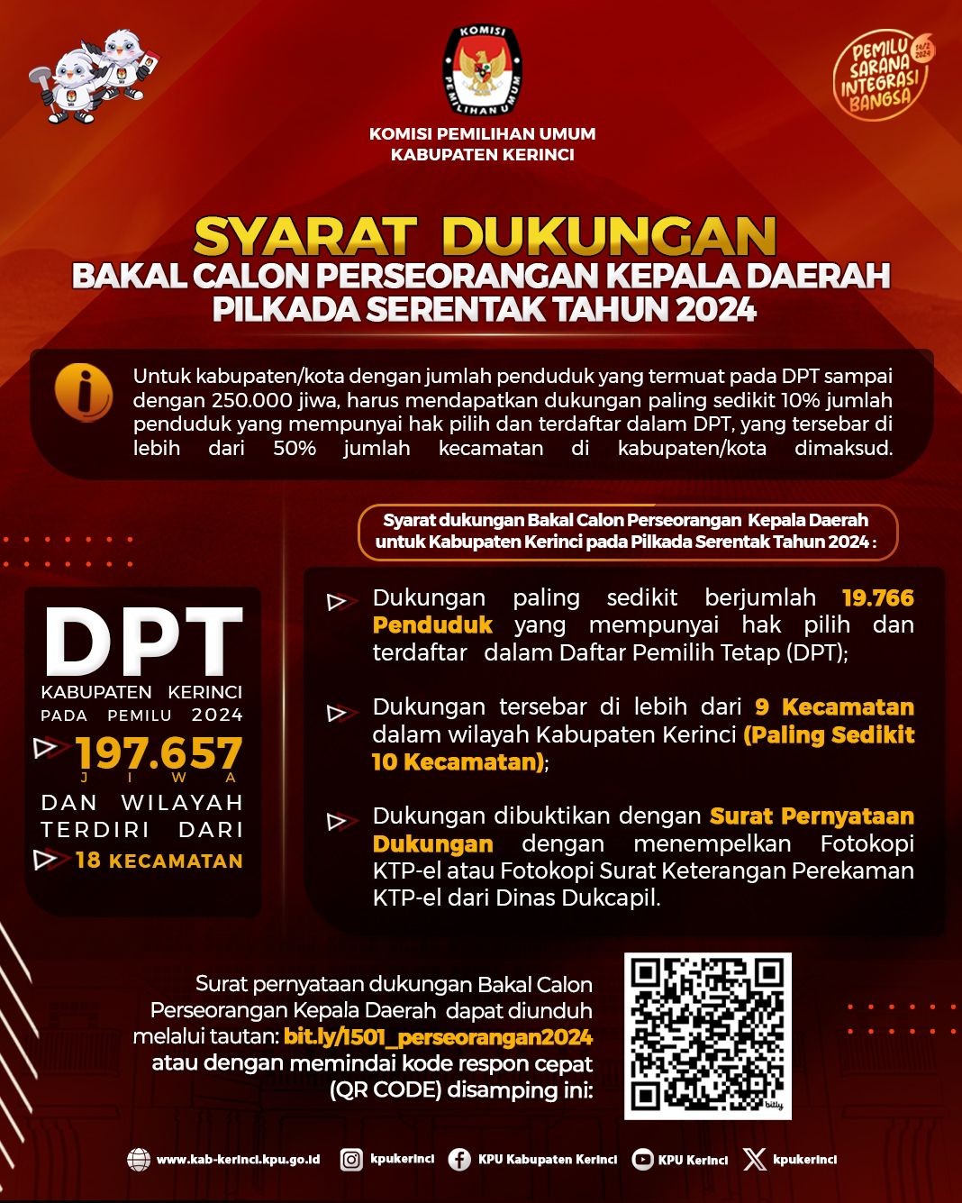 Untuk hal ini, Komisi Pemilihan Umum telah menerbitkan informasi awal terkait salah satu aspek pemenuhan persyaratan dukungan bagi Bakal Pasangan Calon Perseorangan sebagaimana tertuang dalam Surat Dinas Ketua Komisi Pemilihan Umum Republik Indonesia Nomor 507/PL.02.2-SD/05/2024 tertanggal 13 Maret 2024 perihal Surat Pernyataan Dukungan Bakal Pasangan Calon Perseorangan dalam Pemilihan Kepala Daerah Serentak Tahun 2024.