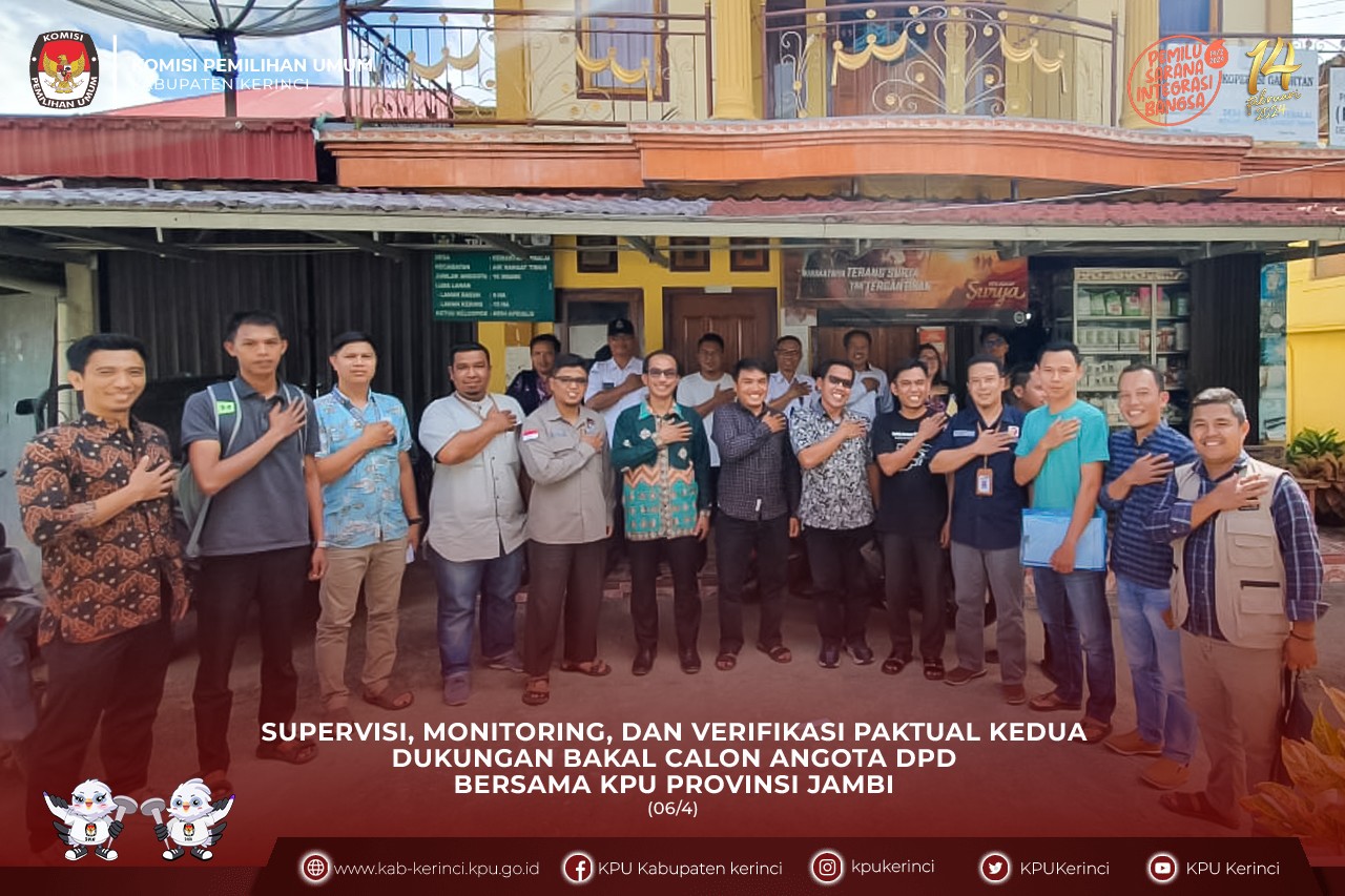 #TemanPemilih, KPU Kabupaten Kerinci bersama KPU Provinsi Jambi melaksanakan Supervisi, Monitoring, dan Verifikasi Paktual Kedua Dukungan Bakal Calon DPD yang sebaran dukungannya terdapat dalam wilayah Kabupaten Kerinci, pada Jumat (06/04/23)