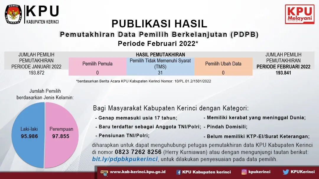 untuk dapat segera menginformasikan melalui tautan bit.ly/pdpbkpukerinci atau secara langsung menghubungi KPU Kabupaten Kerinci agar dilakukan penyesuaian data pada proses Pemutakhiran Data Pemilih Berkelanjutan.