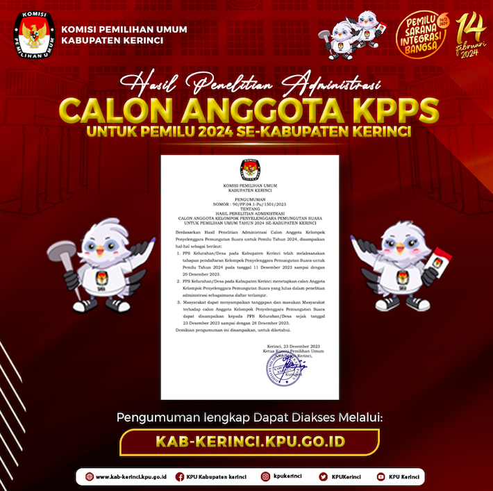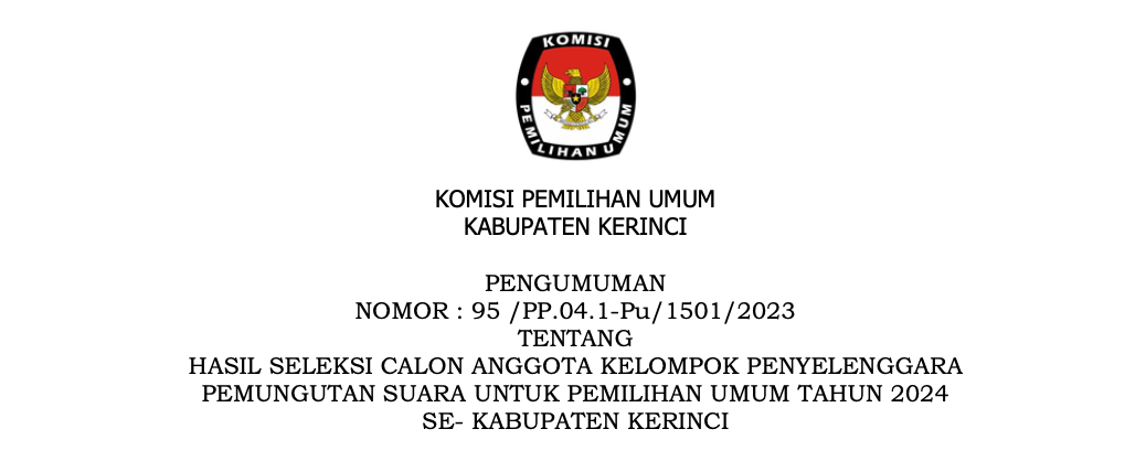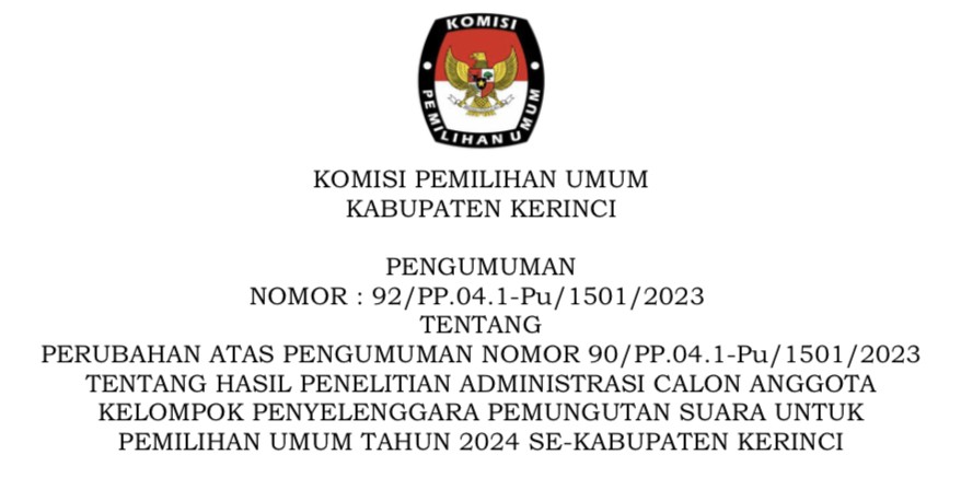 PENGUMUMAN NOMOR : 92/PP.04.1-Pu/1501/2023 TENTANG PERUBAHAN ATAS PENGUMUMAN NOMOR 90/PP.04.1-Pu/1501/2023 TENTANG HASIL PENELITIAN ADMINISTRASI CALON ANGGOTA KELOMPOK PENYELENGGARA PEMUNGUTAN SUARA UNTUK PEMILIHAN UMUM TAHUN 2024 SE-KABUPATEN KERINCI