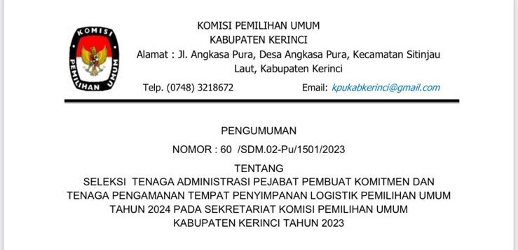 Kantor KPU Kabupaten Kerinci dengan alamat Jalan Angkasa Pura, Desa Angkasa Pura, Kec. Sitinjau Laut, Kabupaten Kerinci, Provinsi Jambi, 37171;